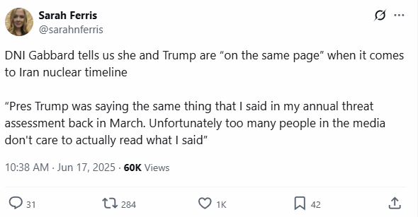 In her March testimony before Congress, Gabbard offered detailed insight into the Intelligence Community’s assessment of the Iranian nuclear threat, which were highlighted in two transcript excerpts posted by Alexa Henning, deputy chief of staff for ODNI.