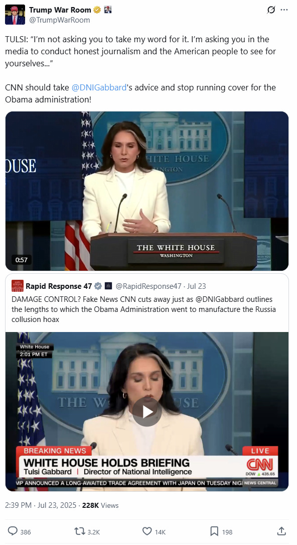 CNN’s Response? PANIC. The network infamously known for breathlessly reporting the Steele dossier and pushing the Russia hoax cut the feed as Gabbard detailed Obama’s criminal involvement.