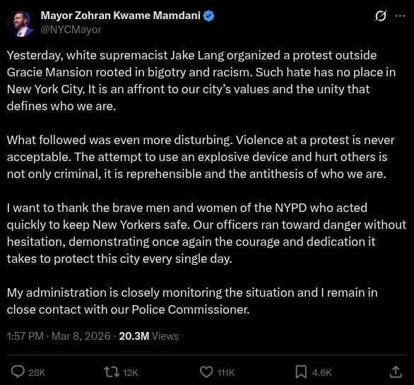 Mamdani issued a statement Saturday that carefully avoided naming the actual suspects or their apparent motivation. He opened his statement by condemning the rally organized by conservative activist Jake Lang, describing it as "rooted in bigotry and racism," then pivoted directly to the explosive devices without making it clear that neither Lang or his group was not responsible for the IED. "What followed was even more disturbing. Violence at a protest is never acceptable. The attempt to use an explosive device and hurt others is not only criminal, it is reprehensible and the antithesis of who we are," his statement read.