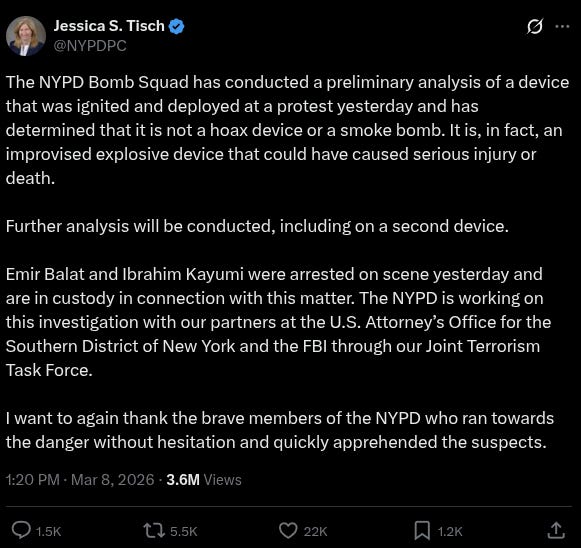 “The NYPD Bomb Squad has conducted a preliminary analysis of a device that was ignited and deployed at a protest yesterday and has determined that it is not a hoax device or a smoke bomb. It is, in fact, an improvised explosive device that could have caused serious injury or death,” Tisch said in a post following the incident. NYPD sources added that the devices were packed with nuts, bolts, and screws, stuffed inside taped canisters fitted with fuses and filled with a chemical substance. The FBI’s Joint Terrorism Task Force responded alongside local authorities.