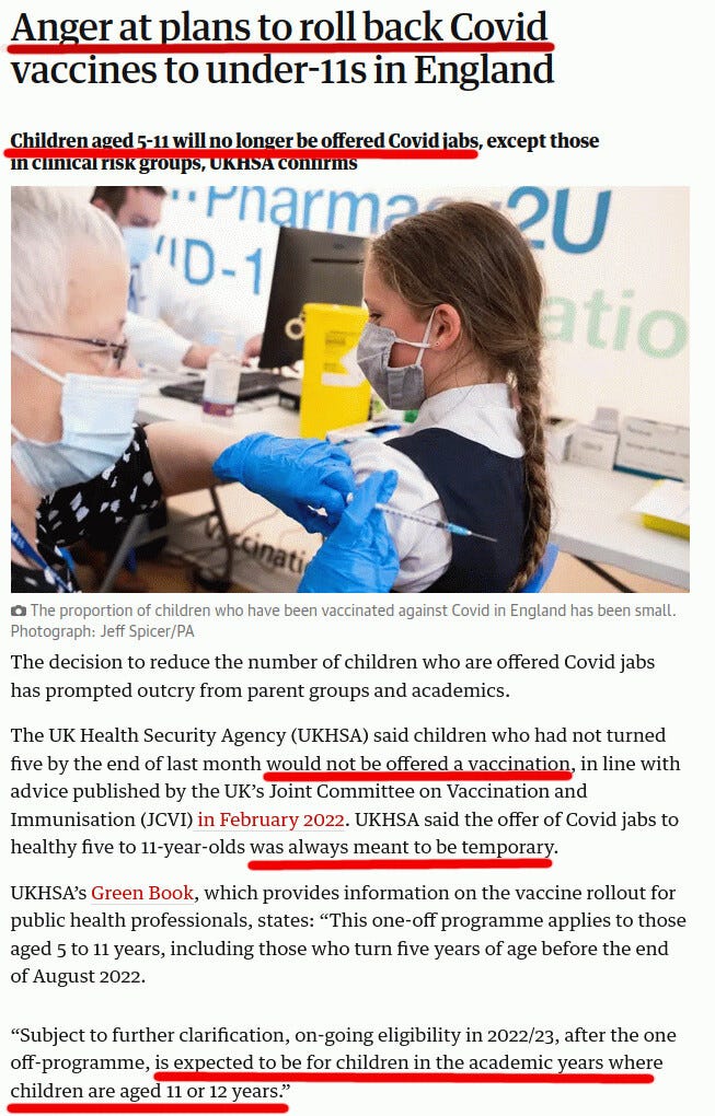 The correct statement is that in the UK, Covid vaccines were just BANNED for all children under 12. Not a single UK child under 12 is allowed to get any doses of Covid vaccines.”