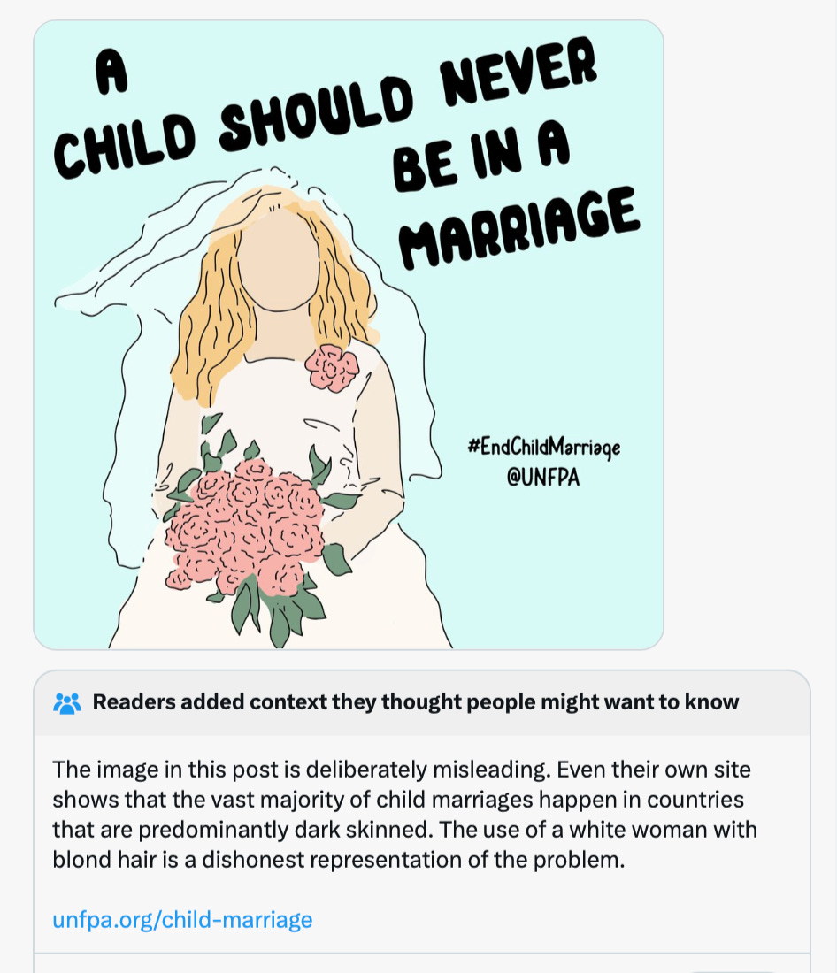 “Even their own site shows that the vast majority of child marriages happen in countries that are predominantly dark skinned. The use of a white woman with blond hair is a dishonest representation of the problem.”