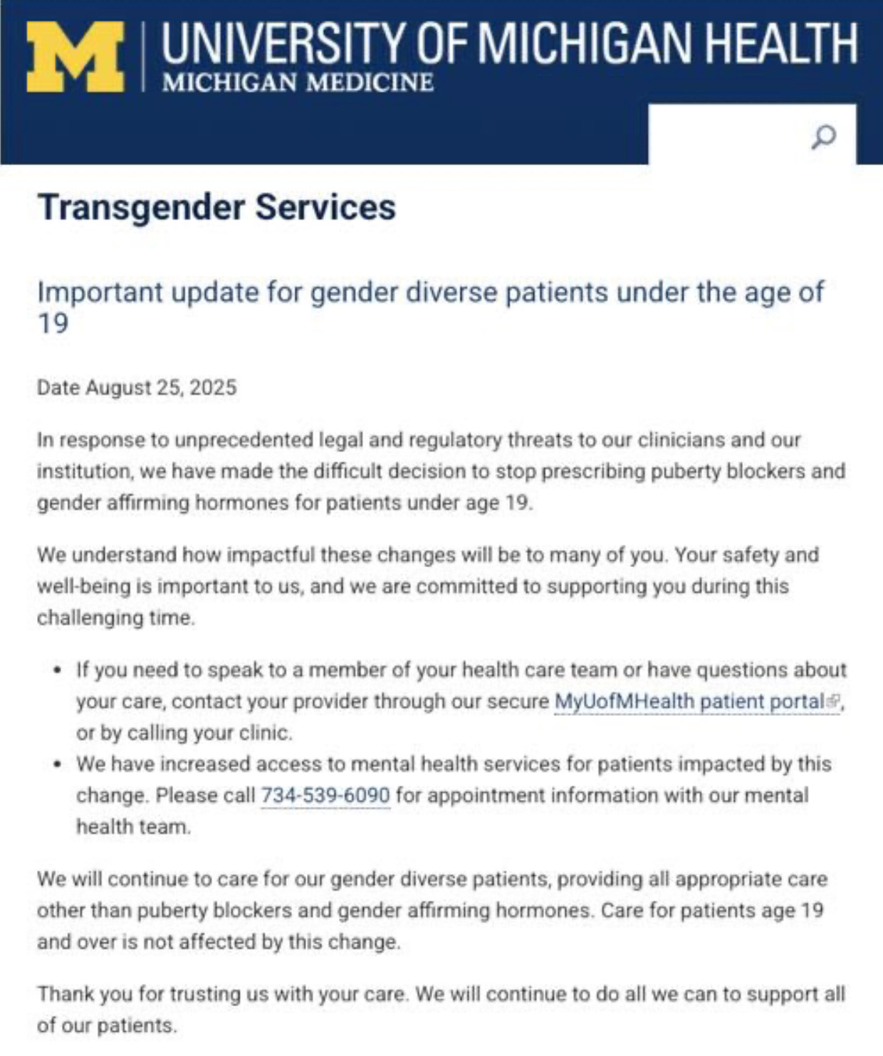 “The University of Michigan, including Michigan Medicine, is one of multiple institutions across the country that has received a federal subpoena as part of a criminal and civil investigation into gender-affirming care for minors,” the statement reads. “In light of that investigation, and given escalating external threats and risks, we will no longer provide gender affirming hormonal therapies and puberty blocker medications for minors.”
