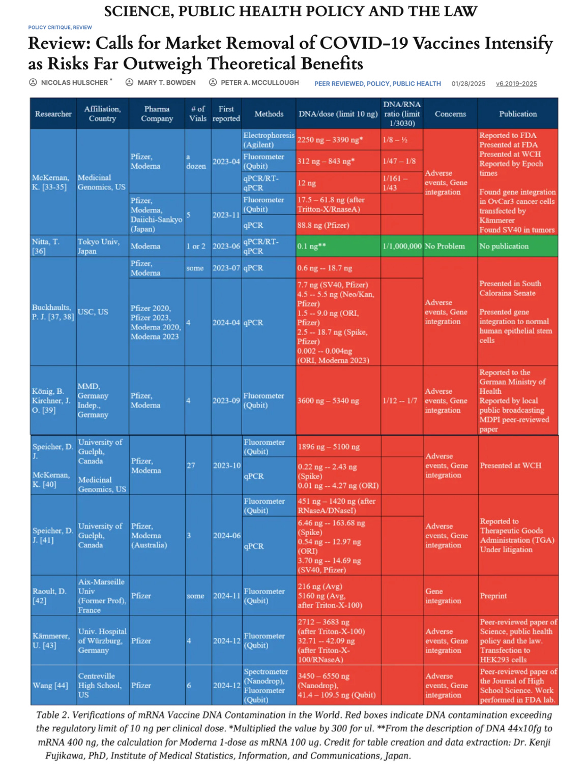 These findings corroborate at least 10 other independent reports from around the world documenting DNA contamination exceeding regulatory limits in Pfizer and Moderna genetic injections—as systematically reviewed in our recent paper, Review: Calls for Market Removal of COVID-19 Vaccines Intensify as Risks Far Outweigh Theoretical Benefits: