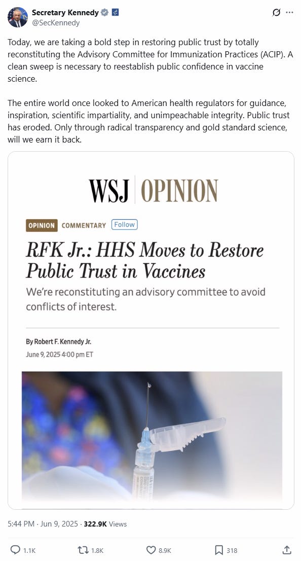 “Today, we are taking a bold step in restoring public trust by totally reconstituting the Advisory Committee for Immunization Practices (ACIP),” RFK Jr. wrote on X.