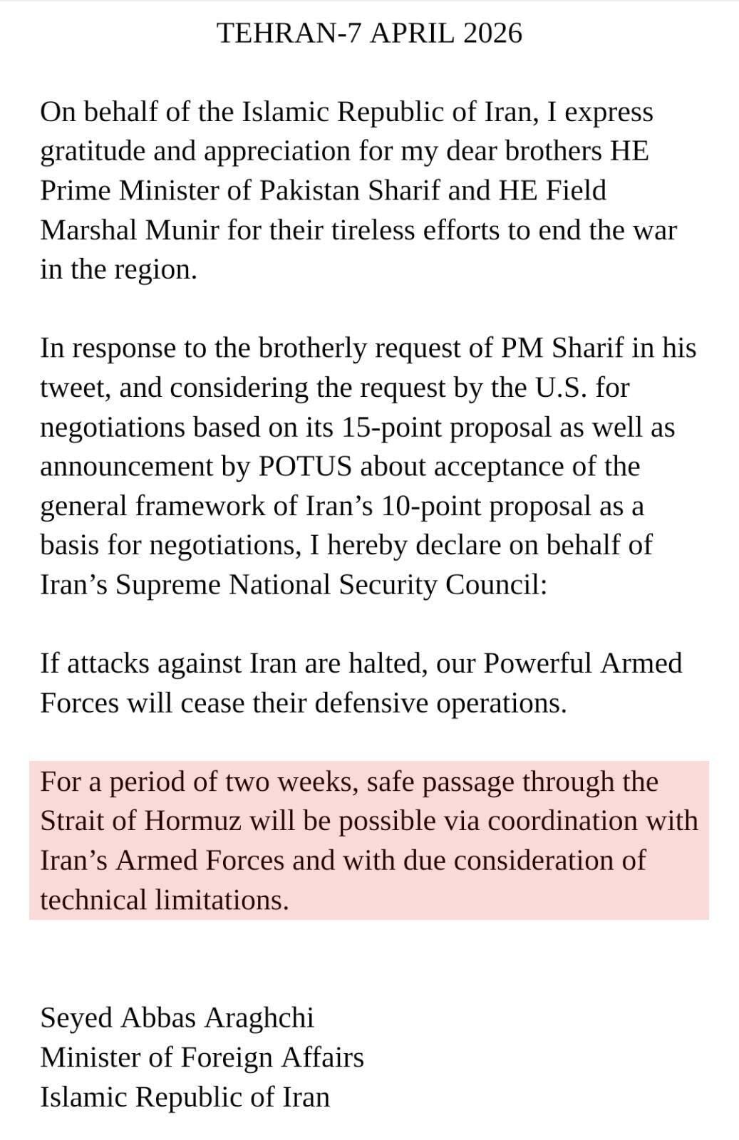 Based on conversations with Prime Minister Shehbaz Sharif and Field Marshal Asim Munir, of Pakistan, and wherein they requested that I hold off the destructive force being sent tonight to Iran, and subject to the Islamic Republic of Iran agreeing to the COMPLETE, IMMEDIATE, and SAFE OPENING of the Strait of Hormuz, I agree to suspend the bombing and attack of Iran for a period of two weeks.