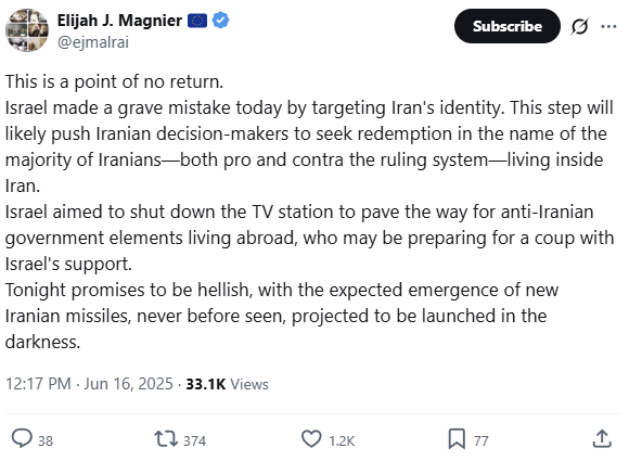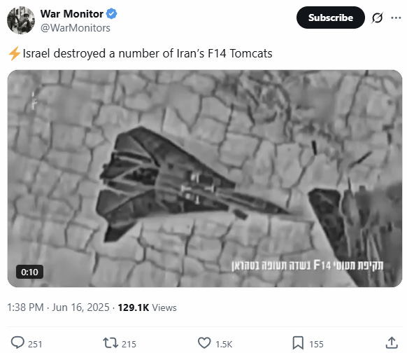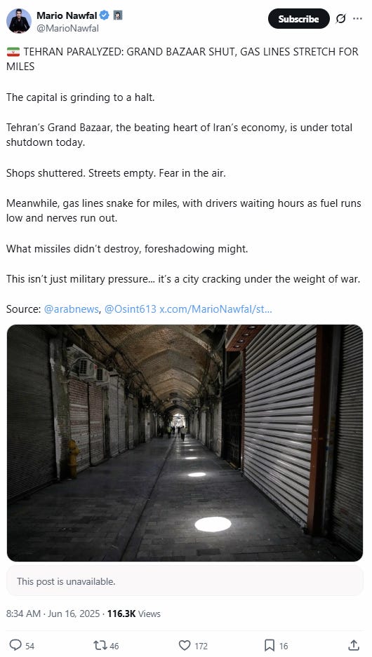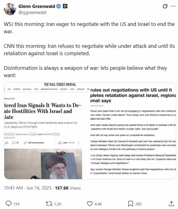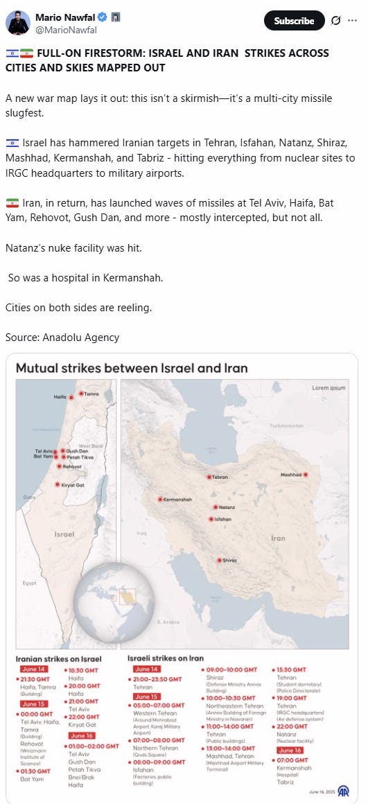 Iran's message is that "it is in the interest of both sides to keep the violence contained" - according to an urgeng diplomatic message passed along. But at this point it seems clear that Israel is going for full regime decapitation, given also that reports say the Israel Air Force has total aerial dominance over Western Iran and skies above Tehran at this point. If these reports of an Iranian olive branch are accurate, is it too-little-too-late?