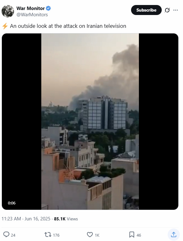 Update(1422ET): Iran is warning of a 'more painful response' if the US fails to rein in Israel, IRNA News is reporting, as more major explosions have been observed in Tehran and across part of Iran. The last 48 hours saw things escalate into sustained daytime strikes, including on Iranian state TV and radio headquarters buildings.