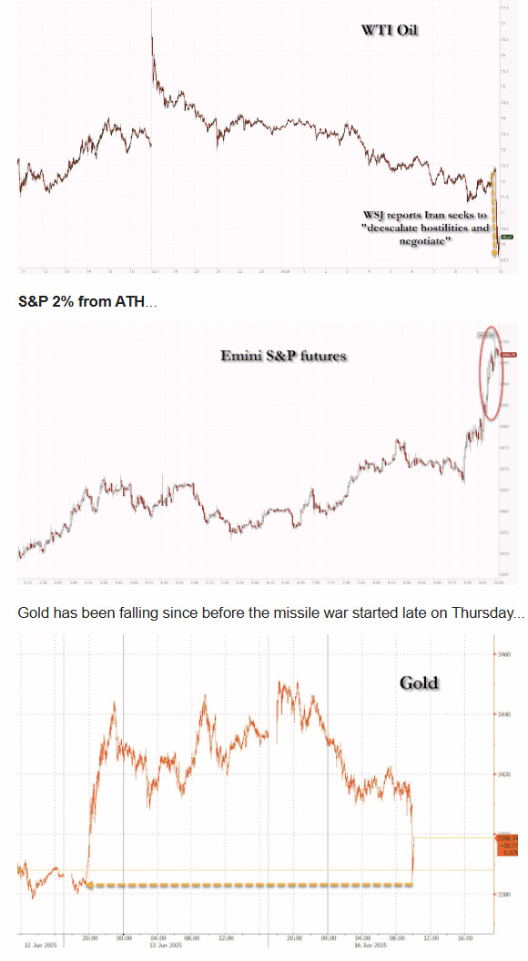 Update(1008ET): Everything is suddenly exploding higher - also with gold and oil dropping - especially on the following WSJ breaking report which suggests (dubiously, we should add...) that the Iranians are 'open' to returning to the negotiating table with Trump officials, even as ballistic missiles rain down on Israel, and as much of the Islamic Republic - particularly oil depots - burn...
