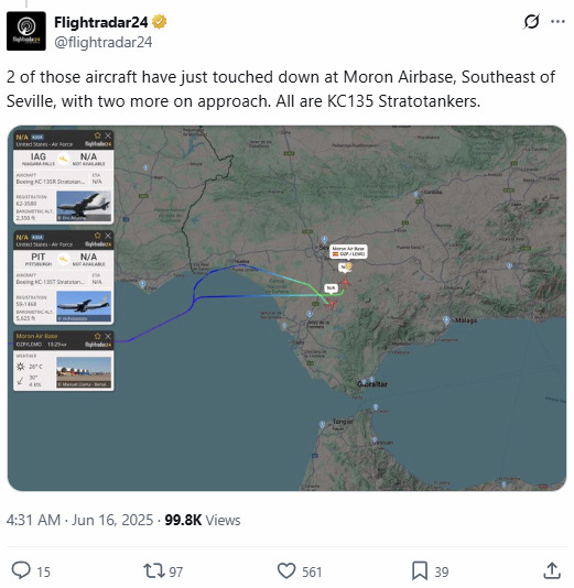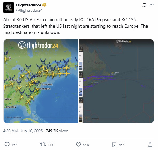 This comes also amid reports that dozens of US Air Force tankers have in the last hours taken off from the United States and headed towards Europe, as also confirmed in Flightradar24 and Air Live. Is Trump ready to join the Israeli side militarily? The Iranians fear so, it appears.