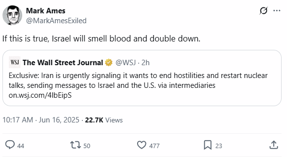 "In the midst of a ferocious Israeli air campaign, Tehran has told Arab officials they would be open to return to the negotiating table as long as the U.S. doesnât join the attack, the officials said. They also passed messages to Israel saying it is in the interest of both sides to keep the violence contained," per WSJ on Monday.