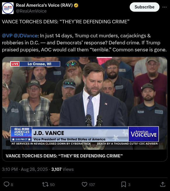 Vance made the remarks during a speech in La Crosse, Wisconsin, noting that Democrats have positioned themselves in favor of criminals in big cities purely because Trump is stepping in to make communities safer.