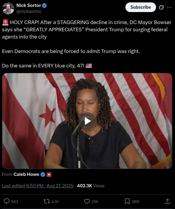 Remarkably, DC Mayor Muriel Bowser, who initially opposed the president’s federal takeover of the capital, has reversed course and actually praised the surge in federal assistance in comments Wednesday.