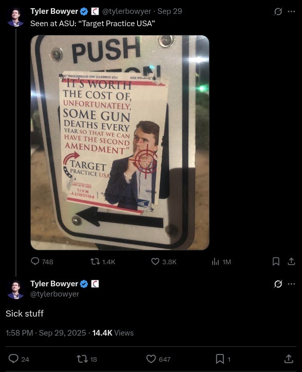 The image was shared by TPUSA Chief Operating Officer, and close friend of Kirk, Tyler Bowyer, who called it “sick stuff.”