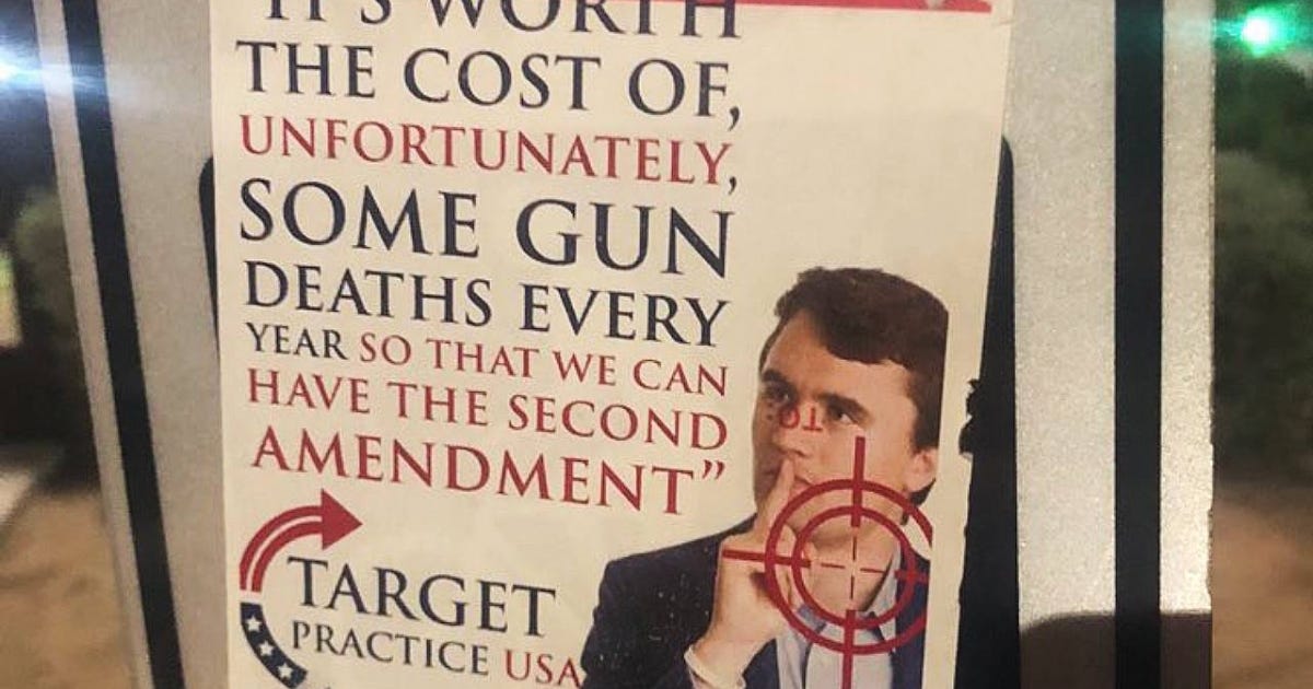 The disgusting poster included a misquoted comment from Kirk concerning the cost of the Second Amendment.