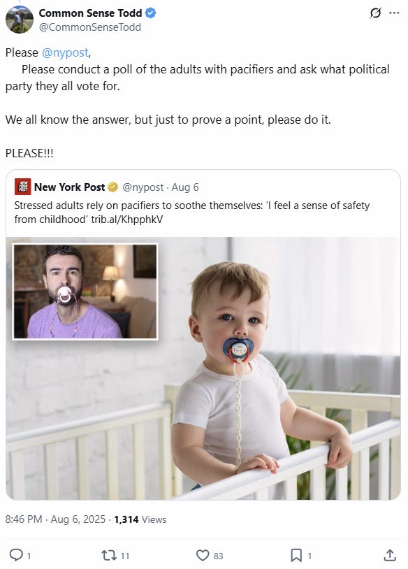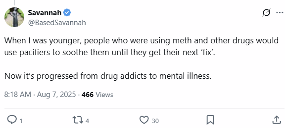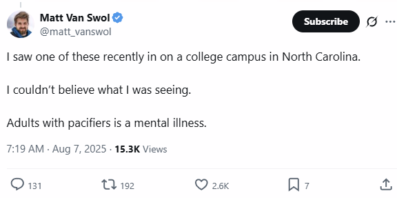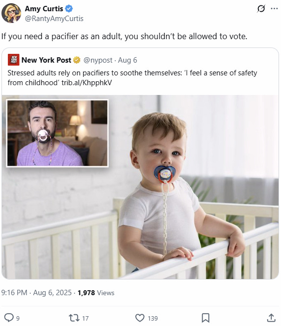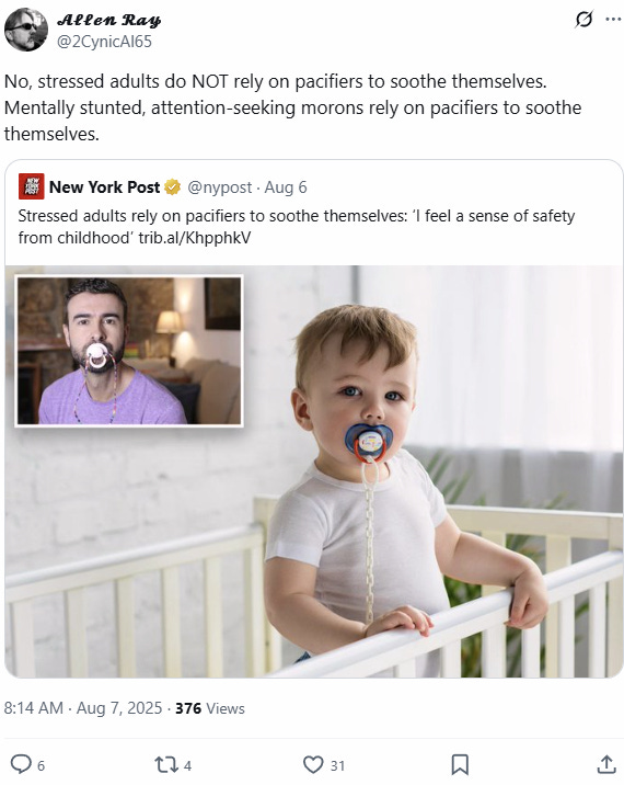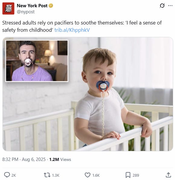 Despite the devices being bad for jaws and teeth and being dangerous to sleep with, people are acting like babies and sucking on pacifiers because they can’t handle the real world.