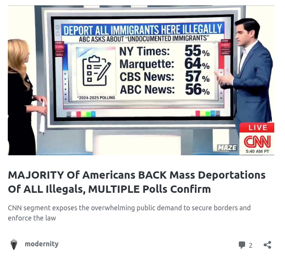 This hypocrisy is all the more glaring given the overwhelming public support for mass deportations. As we previously reported, multiple polls confirm that 55% to 64% of Americans favor deporting all illegal immigrants, with sentiments hardening against unchecked influxes.