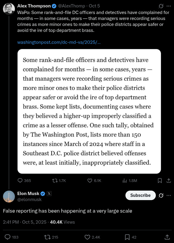 Of course this Sunday night report is all about frontrunning the DOJ release - and narrative control. Such as that it could have simply been an initial lack of evidence - writing that “Criminologists say [zh: wait for it] classifying crimes is an often subjective and evolving process: Incidents can be redefined as investigators uncover more evidence, and disagreements don’t necessarily point to corruption.” And who’s the one criminologist they cited? “Alexis Piquero, a criminologist at the University of Miami who led the Bureau of Justice Statistics during the Biden administration,” who “cautioned against jumping to conclusions that D.C. police were purposefully concealing violent crimes.”