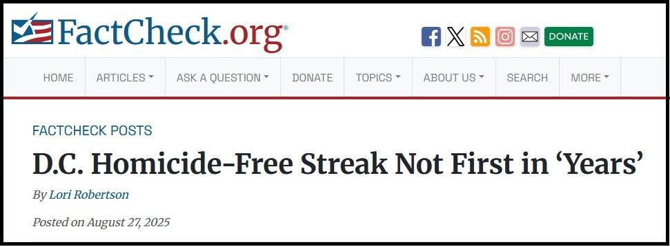 We’re sure the galaxy brains over at FactCheck.org are getting right on that correction after saying President Trump ‘wrongly’ claimed that his DC crackdown resulted in 11 days with no murders, the “first time that’s taken place in years.” They of course make no mention of the DOJ / Congressional investigation Miller announced two days earlier.