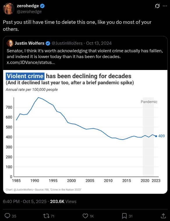 Then, in the home stretch of the election when Trump was clearly ahead (and before Kash Patel could go ‘Ah-ha!’), the 2022 figures were revised - revealing that crime had actually increased by 4.5% in 2022. This textbook Ministry of Truth ‘correction’ was uncovered by John Lott Jr. and published Oct. 16.
