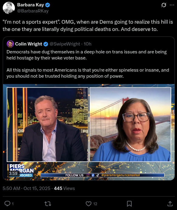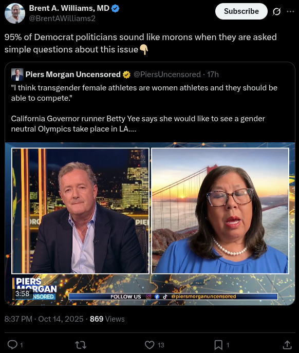 When Morgan pressed for clarification on her position, Yee elaborated: “Well, I I think um we need to learn more about just how we can enable them to to um participate. Um I don’t look everyone is competing in a sport and they come with um abilities and and um perhaps there could be, you know, kind of a different lead for them or we can look at just ways not to exclude them, but I do want them to be able to have that same opportunity to participate.”