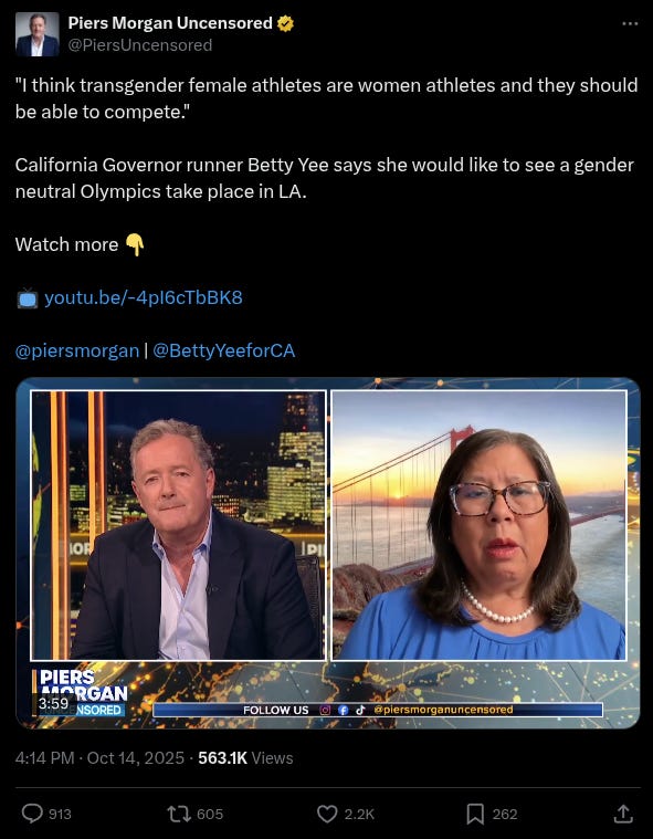 Referencing the upcoming 2028 Olympics in Los Angeles, Morgan asked if she would allow trans athletes in women’s events as governor. Yee replied: “Well, I think there’s still a lot of discussion that needs to happen. Um, I think there’s a lot of information we need to learn about what’s really um happening with uh the ability of trans athletes to compete, but my my statement is about being able to be sure that they can compete. Uh, and right now.”