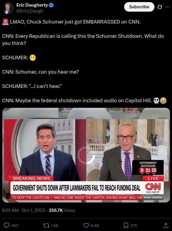 “I don’t think Senator Schumer can hear me right now,” he concluded. “Maybe the federal shutdown included audio on Capitol Hill.”