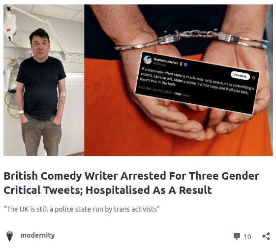 The incident spiked his blood pressure to stroke levels, landing him in hospital amid what he called a “persistent harassment campaign” by trans activists and police.