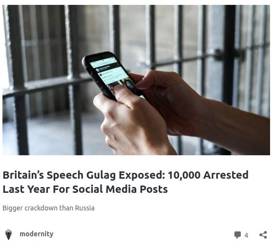 The testimony arrives amid escalating revelations about Britain’s free speech erosion. As we previously highlighted, some 10,000 arrests were made in 2024 for “grossly offensive” social media posts—30 per day—under vague communications laws, outpacing even Russia’s crackdown while real crimes like knife attacks and burglaries fester unsolved.