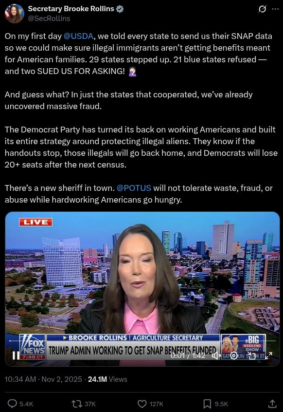 Rollins said that 21 states refused to hand over data to the Department of Government Efficiency regarding whether illegal aliens were claiming SNAP benefits fraudulently. Two states sued the USDA.