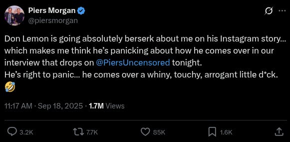 “Don Lemon is going absolutely berserk about me on his Instagram story… which makes me think he’s panicking about how he comes over in our interview that drops on @PiersUncensored tonight,” Morgan posted on X ahead of the interview.