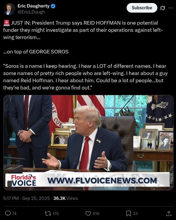 “And Reid Hoffman? This guy’s out there funding the same radical fringe that wants to burn it all down. We’re looking into Soros because I think it’s a RICO case against him and others. This is more than protests – this is conspiracy against the United States.”
