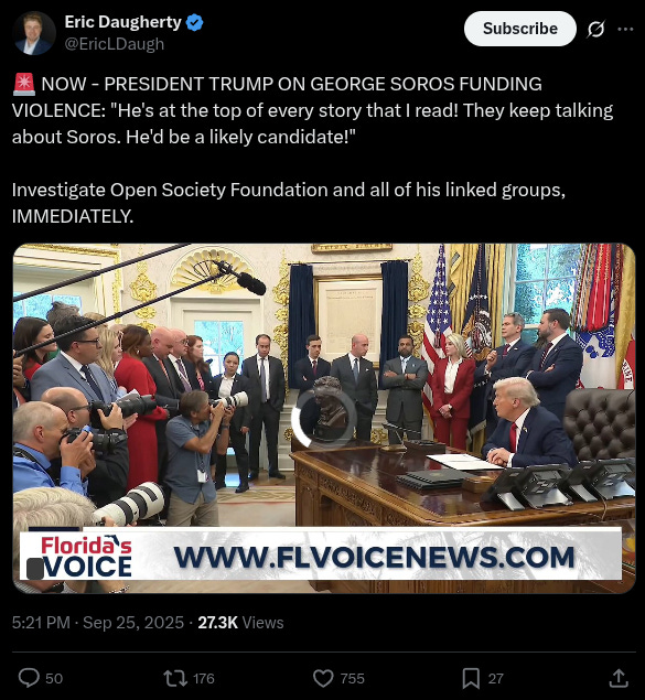 “Look at George Soros – he’s poured tens of millions into groups that glorify terrorism and urge violence against our law enforcement,” Trump said, referencing a recent Capital Research Center report alleging Soros’s Open Society Foundations funneled over $80 million to organizations linked to Antifa and protest actions meeting the FBI’s domestic terrorism criteria.