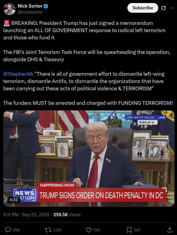 The order builds on Trump’s previous executive action formally designating Antifa – the decentralized, anti-fascist movement – as a “domestic terrorist organization.”