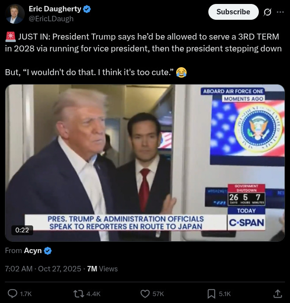 In remarks made while aboard Airforce One en route to Japan, President Trump addressed the possibility of running for a third term.