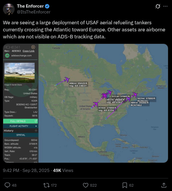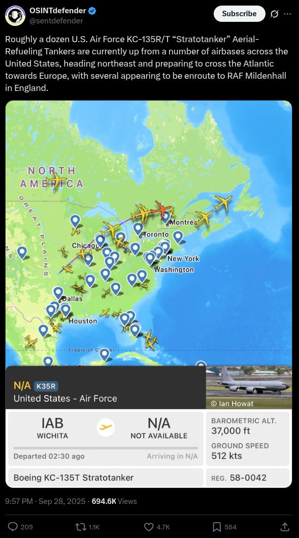 OSINT-focused X accounts cite flight tracking data that shows a wave of U.S. air tankers deploying to Europe. The timing coincides with President Trump’s scheduled last-minute meeting with senior military leadership in northern Virginia on Tuesday.