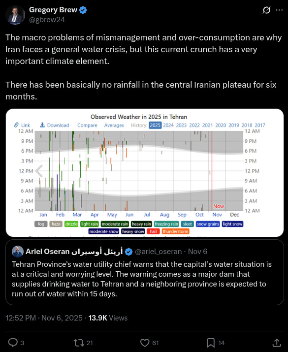 Coming off a very ‘hot’ geopolitical summer which saw Israel and the US attack Tehran and the Islamic Republic’s nuclear energy facilities, Iran is now facing yet another immensely threatening crisis amid historic drought: lack of water for the population of 90+ million.