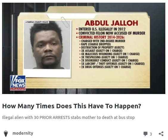 These incidents are part of a relentless pattern. Just weeks ago, a Sierra Leone illegal with over 30 prior arrests — including rape — stabbed a Virginia mother to death at a bus stop.