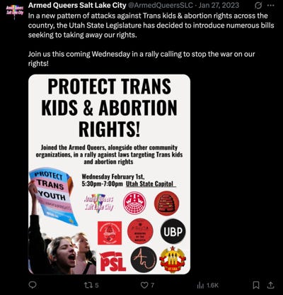 Further down the rabbit hole on Armed Queers, this one appears to be the Salt Lake City branch, which organized a rally in 2023 with a number of radical leftist groups.