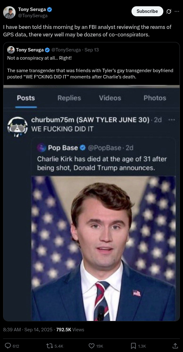 Also, research analyst Tony Seruga wrote on X, "I have been told this morning by an FBI analyst reviewing the reams of GPS data, there very well may be dozens of co-conspirators."