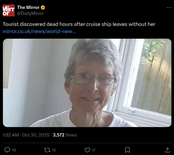 She added, âShe was asked to head down, unescorted. Then the ship left, apparently without doing a passenger count. At some stage in that sequence, or shortly after, Mom died, alone.â