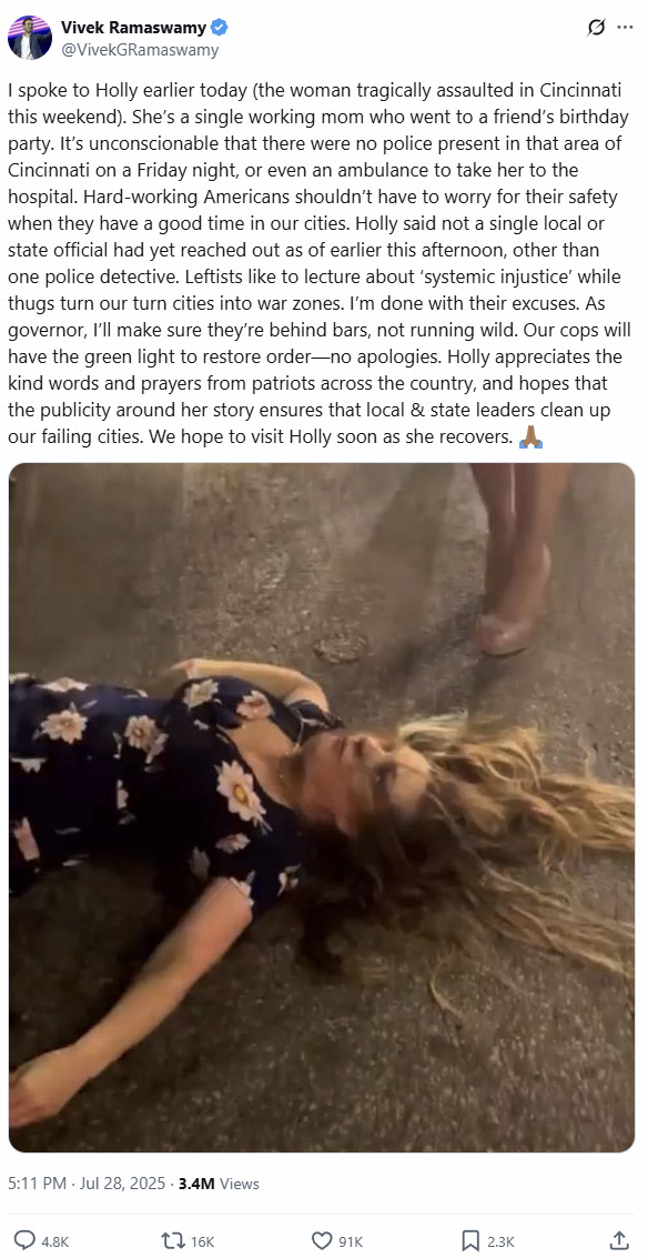 âI spoke to Holly earlier today (the woman tragically assaulted in Cincinnati this weekend). Sheâs a single working mom who went to a friendâs birthday party,â Ramaswamy wrote. âItâs unconscionable that there were no police present in that area of Cincinnati on a Friday night, or even an ambulance to take her to the hospital.â