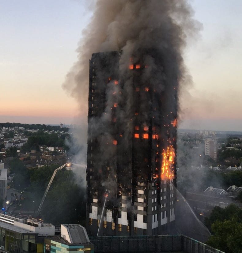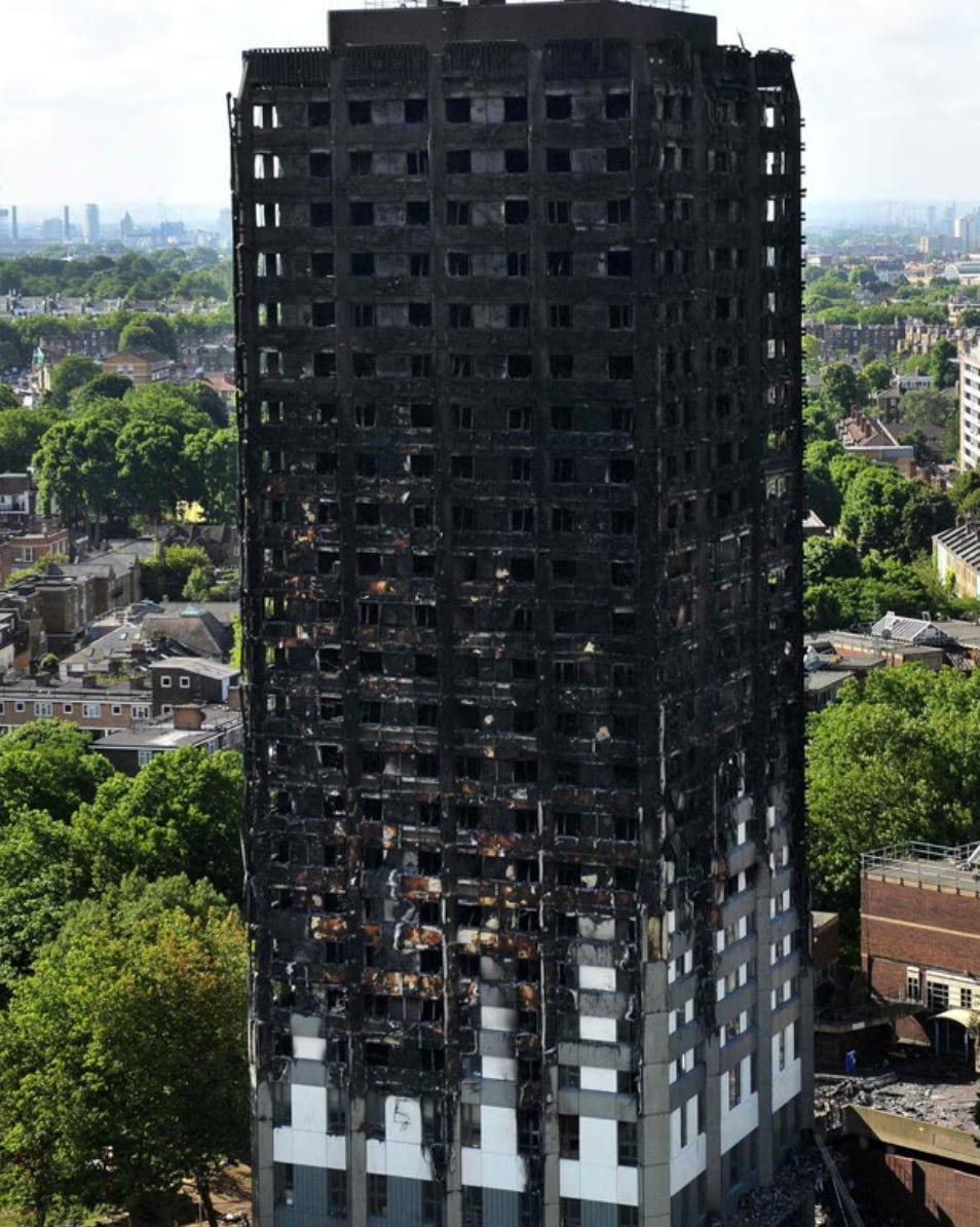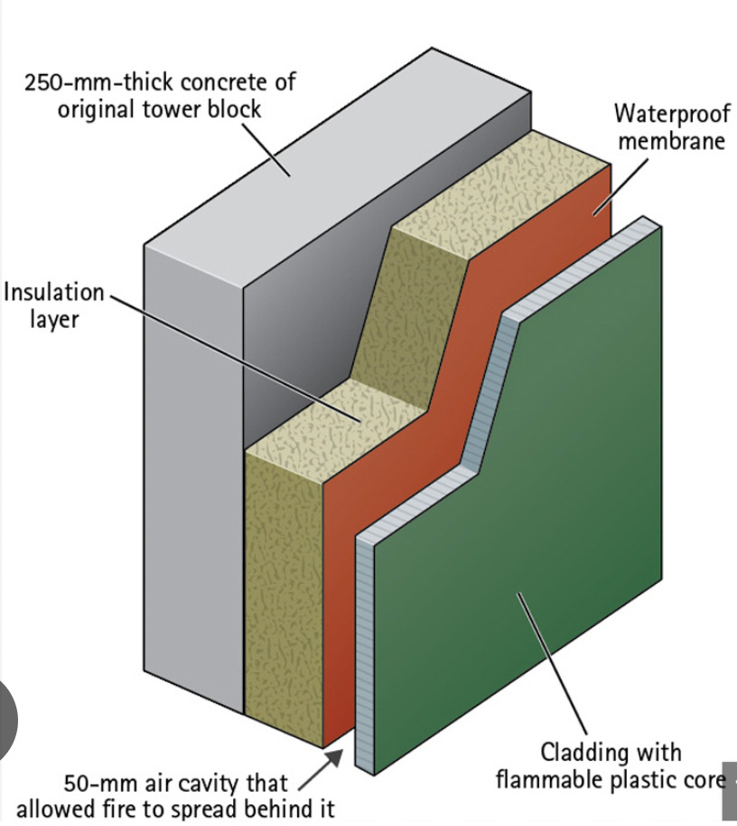 Note that the remaining structure is not sagging at all. An especially remarkable feature of Grenfell Tower is that was clad with combustible ACM (Aluminum Composite Material). This cladding, with its polyethylene (PE) plastic core and insulation, created an air gap behind the facade. This gap, combined with the building's triangular columns, acted like a chimney, allowing fire to rapidly spread vertically up the outside of the building, bypassing internal fire safety measures and leading to the catastrophic blaze.