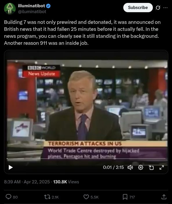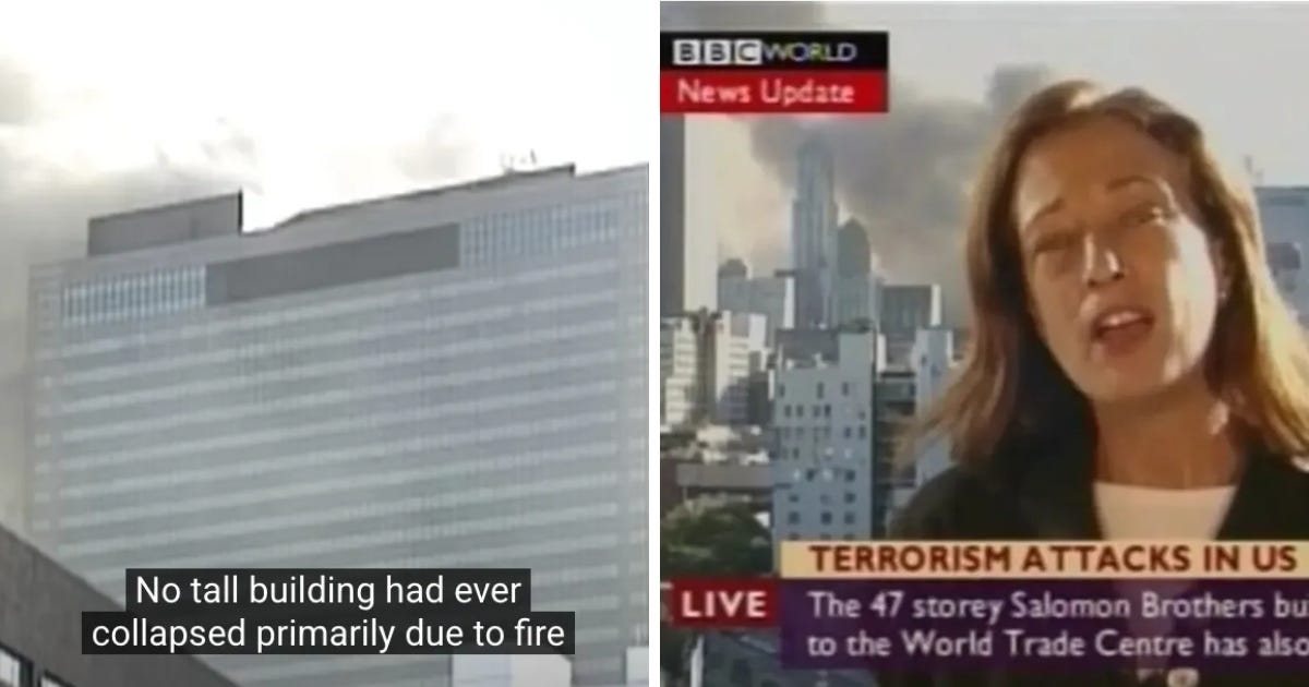 An especially intriguing element of the timeline was that the BBC announced the building’s collapse before it actually happened. Here is a BBC reporter making the announcement while the building is still standing behind her (see upper right corner behind her right shoulder).