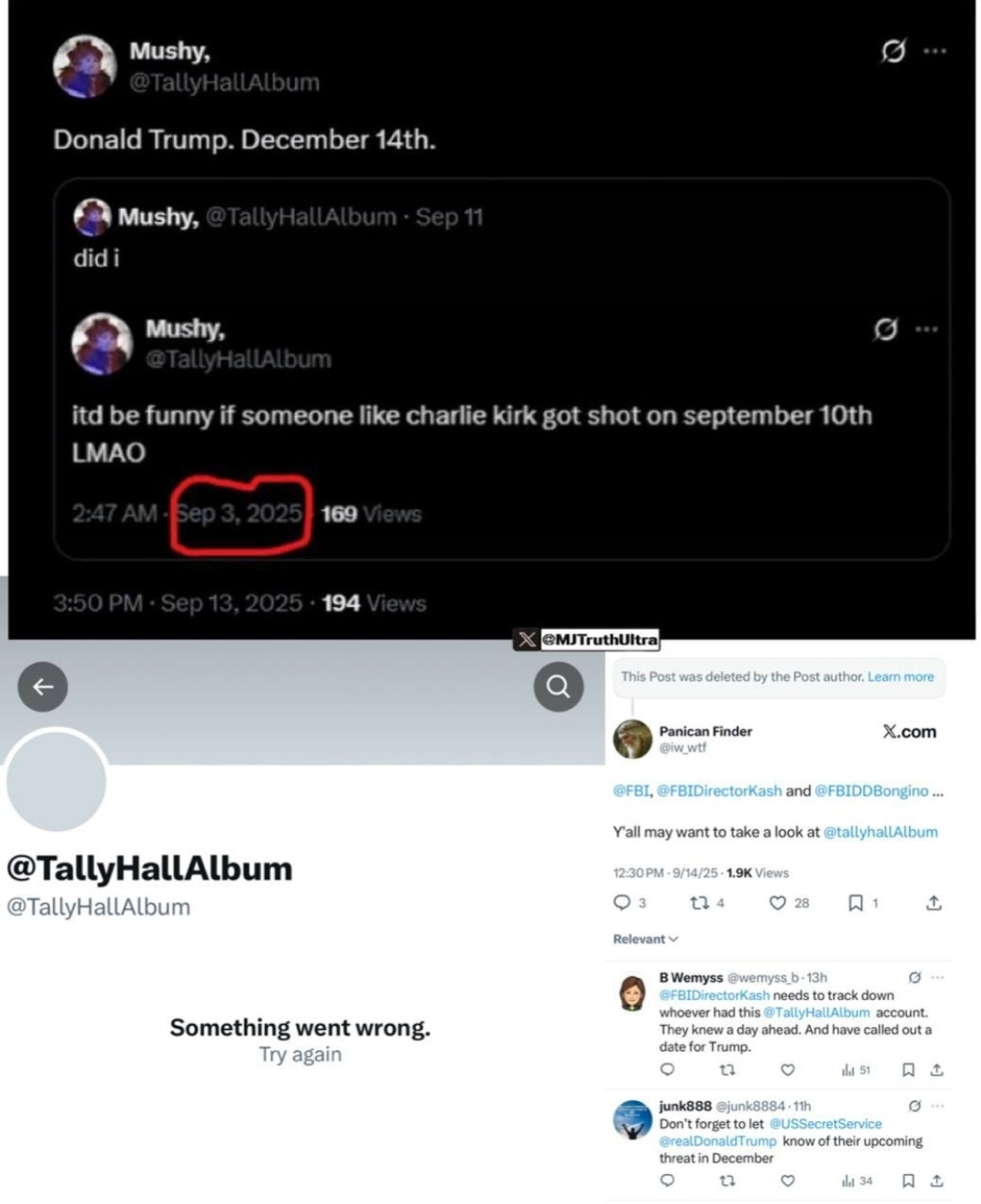The account, @TallyHallAlbum, posted an eerily specific “joke” on September 3, declaring it would be “funny if someone like Charlie Kirk got shot on September 10th LMAO.”