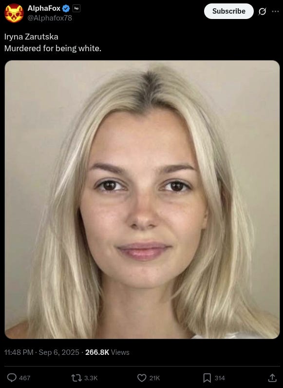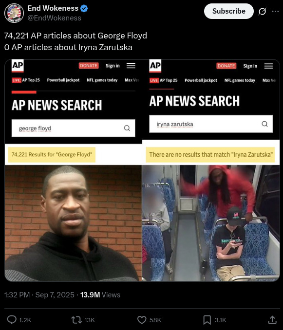 Social media users blasted the legacy media for ignoring the brutal murder of Ukrainian refugee Iryna Zarutska, who was stabbed to death on a light rail train in North Carolina last month by a homeless man with a lengthy rap sheet.