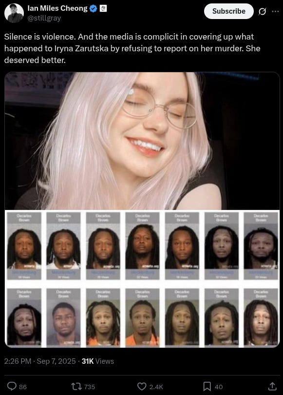 “Silence is violence. And the media is complicit in covering up what happened to Iryna Zarutska by refusing to report on her murder,” posted X user Ian Miles Cheong. “She deserved better.”
