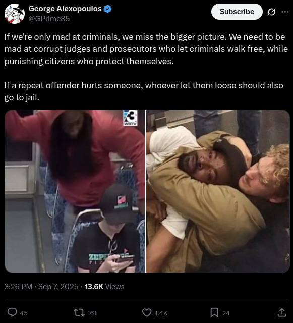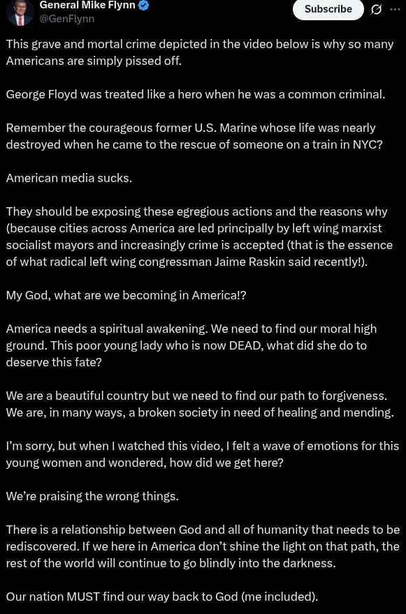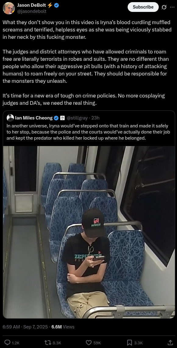 Yet another X user underscored how the edited footage, stopped right before the brutal murder, spared viewers the tragic scene that unfolded, and blamed liberal judges, district attorneys and Democrat policies for the incident.