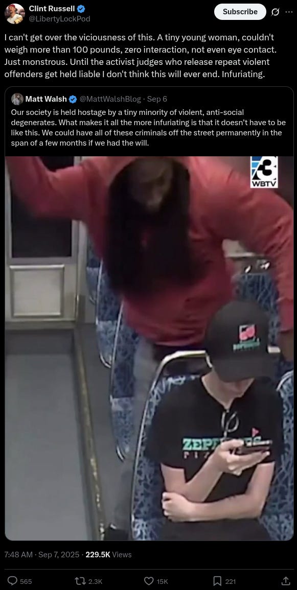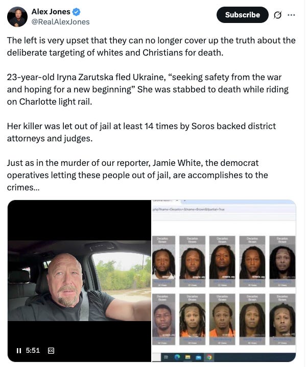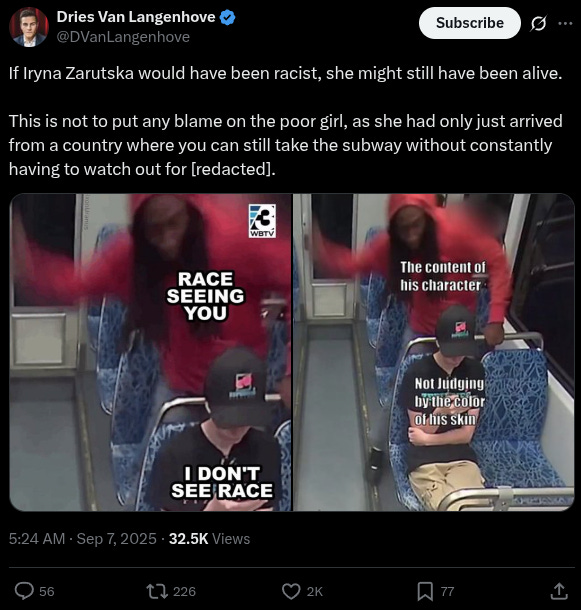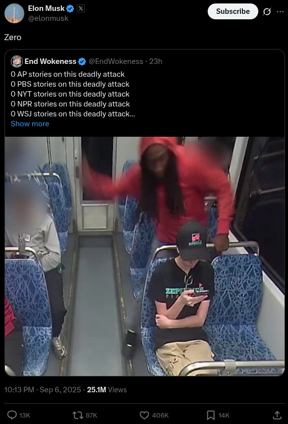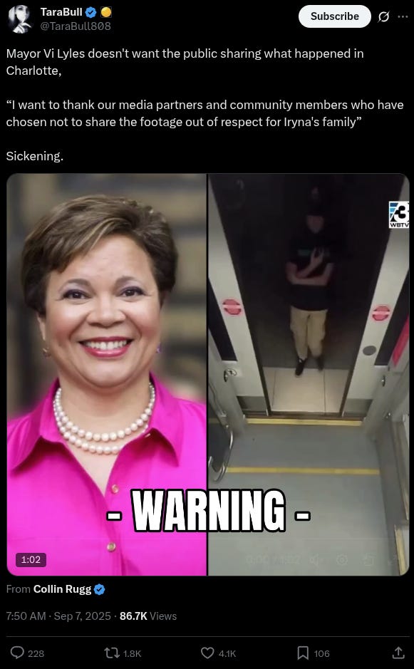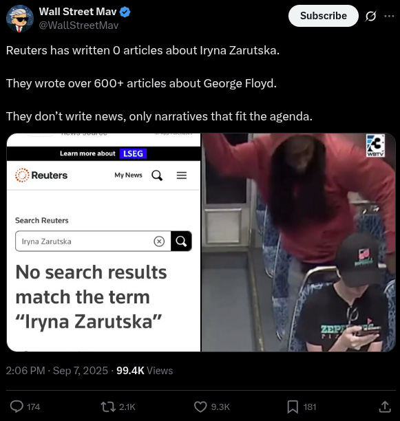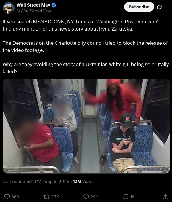 “If you search MSNBC, CNN, NY Times or Washington Post, you won’t find any mention of this news story about Iryna Zarutska,” noted @WallStreetMav, adding, “The Democrats on the Charlotte city council tried to block the release of the video footage.”