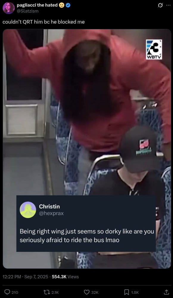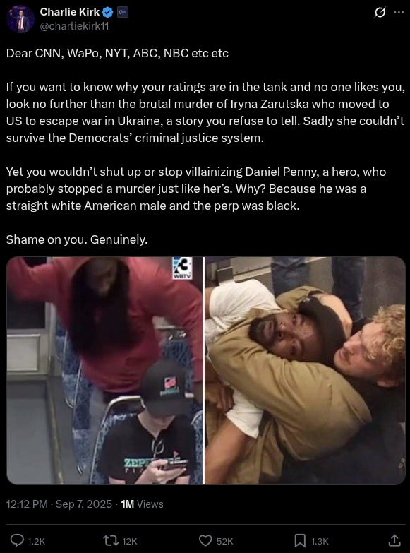 “If you want to know why your ratings are in the tank and no one likes you, look no further than the brutal murder of Iryna Zarutska who moved to US to escape war in Ukraine, a story you refuse to tell. Sadly she couldn’t survive the Democrats’ criminal justice system,” commented TPUSA’s Charlie Kirk.